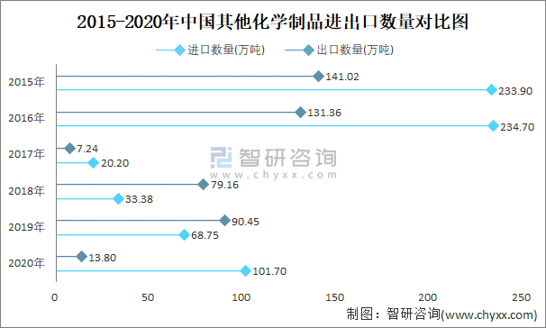 2015-2020年中國其他化學制品進出口數量對比統計圖