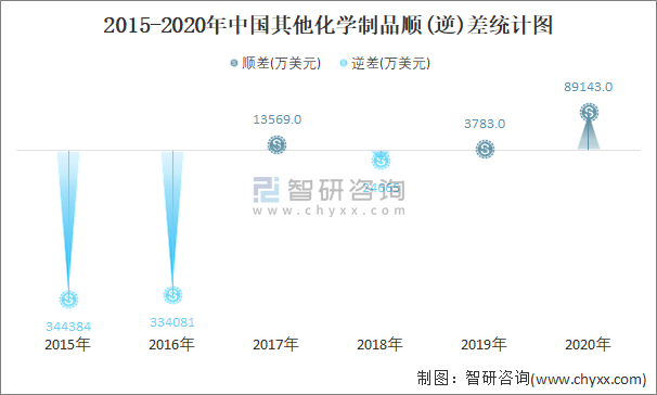 2015-2020年中國其他化學制品順(逆)差統計圖