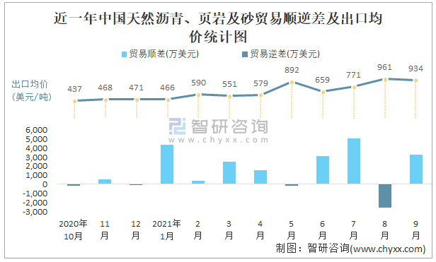 根據(jù)中國石油和化學(xué)工業(yè)聯(lián)合會數(shù)據(jù)顯示:2021年9月中國天然瀝青、頁巖及砂進(jìn)口數(shù)量為1.3萬噸,出口數(shù)量為4.7萬噸;進(jìn)口金額為1110萬美元,出口金額為4391萬美元;近一年中國天然瀝青、頁巖及砂出口總金額大于進(jìn)口總金額,貿(mào)易順差為主,出口均價934美元/噸。