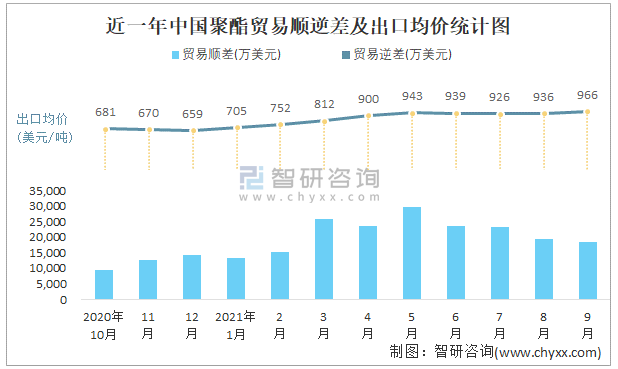 根據(jù)中國石油和化學(xué)工業(yè)聯(lián)合會數(shù)據(jù)顯示:2021年9月中國聚酯進(jìn)口數(shù)量為3.6萬噸,出口數(shù)量為23.8萬噸;進(jìn)口金額為4451萬美元,出口金額為22982萬美元;近一年中國聚酯出口總金額大于進(jìn)口總金額,貿(mào)易順差為主,出口均價966美元/噸。