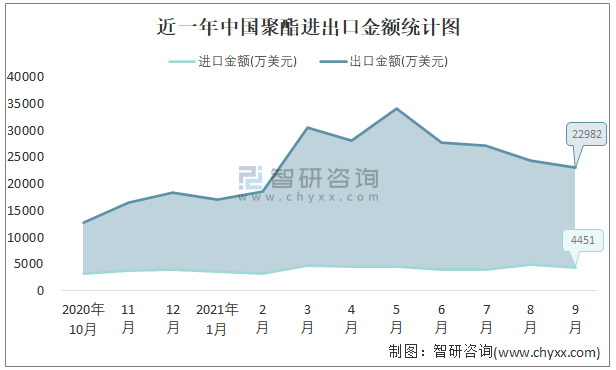 近一年中國聚酯進(jìn)出口金額統(tǒng)計圖