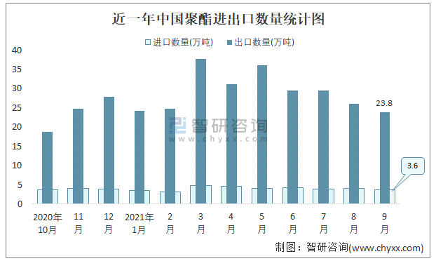 2021年9月中國聚酯進(jìn)出口數(shù)量分別為3.6萬噸和23.8萬噸