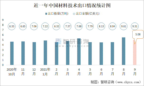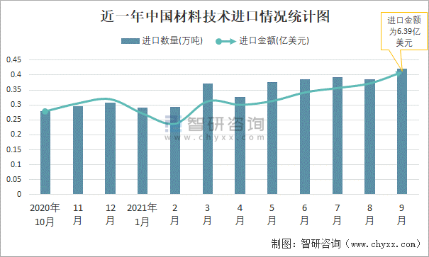 根據中國海關數據顯示:2021年9月中國材料技術進口數量為0.42萬噸,同比下降20.8%,進口金額為6.39億美元,同比增長31.1%,2021年9月中國材料技術出口數量為5.08萬噸,同比增長2%,出口金額為9.31億美元,同比增長47.7%;2021年1-9月中國材料技術進口數量為3.29萬噸,進口金額為45.59億美元,出口數量為44.02萬噸,出口金額為71.41億美元。