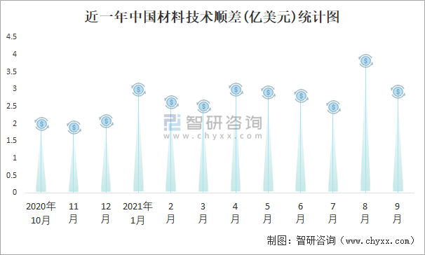 近一年中國材料技術順差(億美元)統計圖