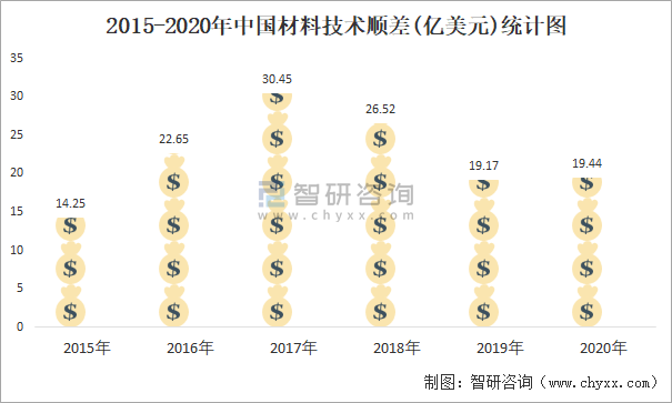 2015-2020年中國材料技術順差(億美元)統計圖