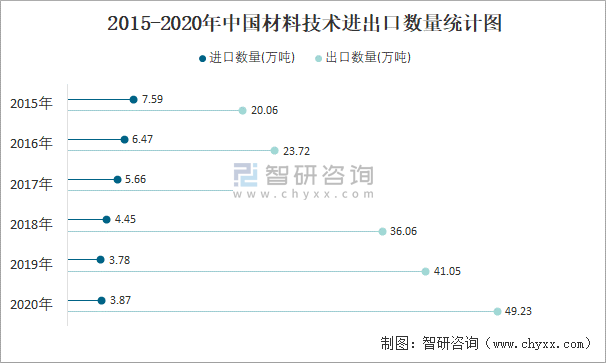 2015-2020年中國材料技術進出口數量統計圖