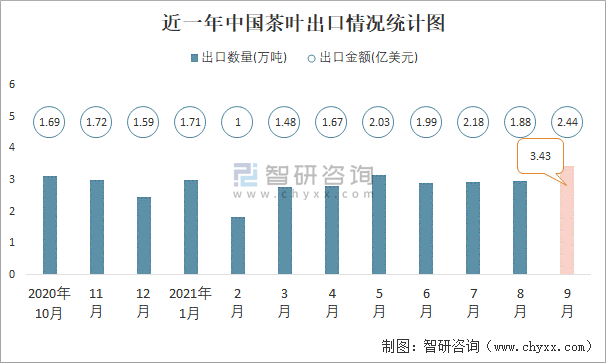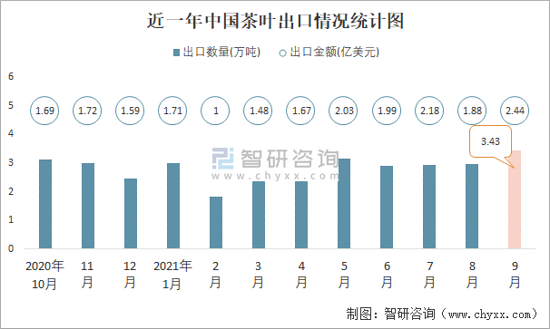 根據中國海關數據顯示:2021年9月中國茶葉出口數量為3.43萬噸,同比增長17.9%,出口金額為2.44億美元,同比增長54.5%;2021年1-9月中國茶葉出口數量為25.81萬噸,出口金額為16.37億美元。