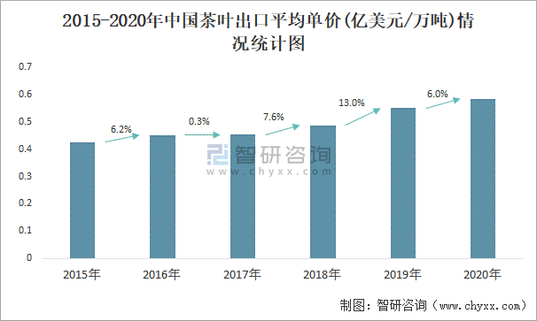 2015-2020年中國茶葉出口平均單價(億美元/萬噸)情況統計圖
