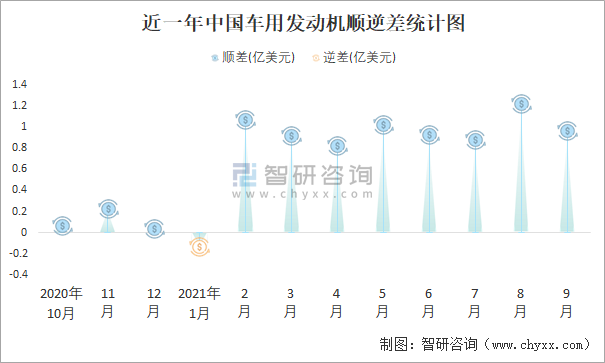 近一年中國(guó)車用發(fā)動(dòng)機(jī)順逆差(億美元)統(tǒng)計(jì)圖