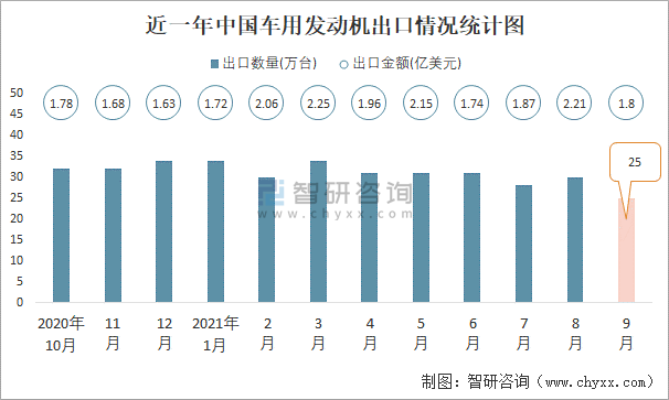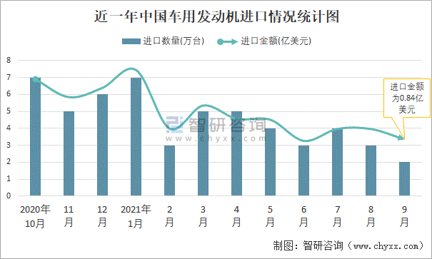 根據(jù)中國(guó)海關(guān)數(shù)據(jù)顯示:2021年9月中國(guó)車用發(fā)動(dòng)機(jī)進(jìn)口數(shù)量為2萬臺(tái),同比下降65%,進(jìn)口金額為0.84億美元,同比下降48.3%,2021年9月中國(guó)車用發(fā)動(dòng)機(jī)出口數(shù)量為25萬臺(tái),同比下降24.7%,出口金額為1.8億美元,同比下降0.8%;2021年1-9月中國(guó)車用發(fā)動(dòng)機(jī)進(jìn)口數(shù)量為36萬臺(tái),進(jìn)口金額為10.1億美元,出口數(shù)量為275萬臺(tái),出口金額為17.74億美元。