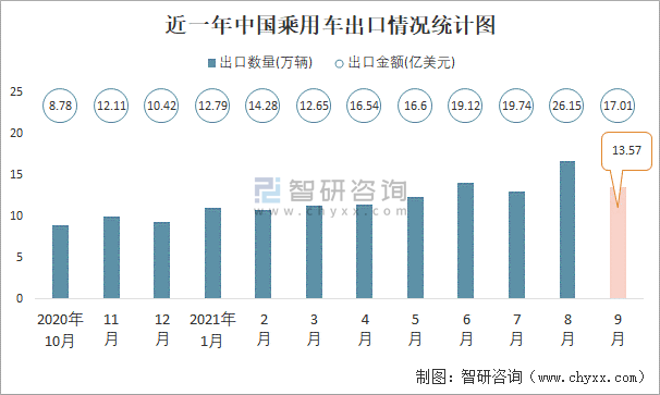 2021年9月中國乘用車進出口數量分別為7.81萬輛和13.57萬輛