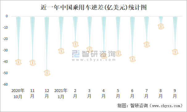 近一年中國乘用車逆差(億美元)統計圖