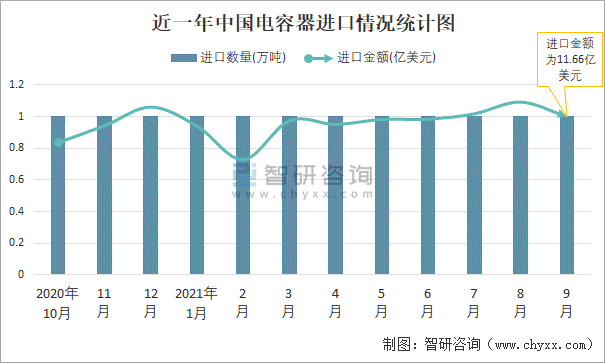 根據中國海關數據顯示:2021年9月中國電容器進口數量為1萬噸,同比下降0.6%,進口金額為11.66億美元,同比增長3.9%,2021年1-9月中國電容器進口數量為6萬噸,進口金額為101.07億美元。
