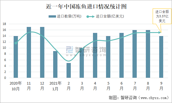 2021年9月中國凍魚進口數量和進口金額分別為14萬噸和3.37億美元