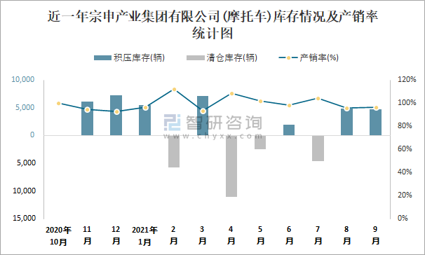 近一年宗申產業集團有限公司庫存情況及產銷率統計圖
