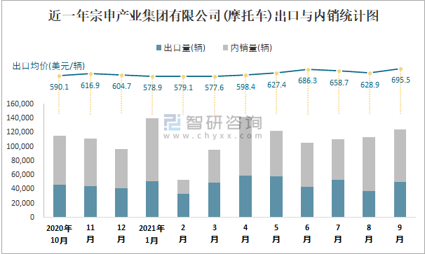 根據中國汽車工業(摩托車)產銷快訊數據統計可知:近一年宗申產業集團有限公司(摩托車)共積壓庫存13551輛,其產銷率存在一定幅度波動,2月產銷率最高(111.96%),清倉庫存5707輛,2020年12月產銷率偏低(93%),積壓庫存7285輛;近一年宗申產業集團有限公司(摩托車)出口量偏少,銷量以內銷為主,總出口量占比總銷量的42.7%,出口均價9月達到最高值,其中9月出口量為49841輛,出口均價約為695.48美元/輛;2021年1-9月宗申產業集團有限公司(摩托車)累計出口量為436337輛,同比增長46.06%,累計出口金額約為27313.34萬美元,同比增長61.96%。