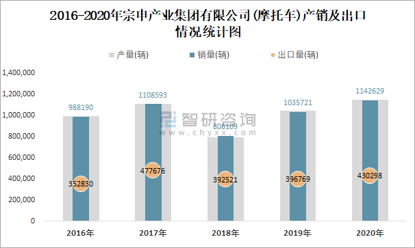 2016-2020年宗申產業集團有限公司產銷及出口情況統計圖