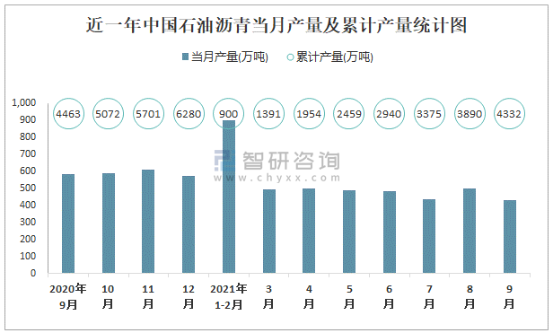 根據國家統計局數據顯示:2021年9月中國石油瀝青產量為433萬噸,同比下降26.4%;2021年1-9月中國石油瀝青累計產量為4331.6萬噸,累計下降3.9%;2015-2020年中國石油瀝青產量逐年遞增,2020年達到最高。