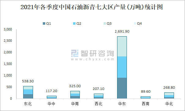 2021年各季度中國石油瀝青七大區產量統計圖