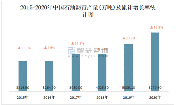 2015-2020年中國石油瀝青產量及累計增長率統計圖