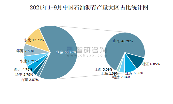 2021年1-9月中國石油瀝青產量大區占比統計圖