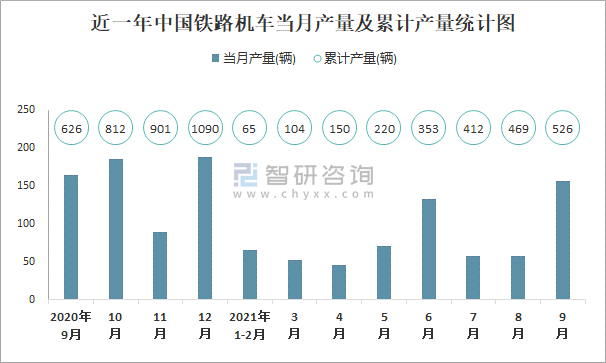 2021年1-9月中國鐵路機車產量為526輛 西北地區產量最高(占比28.5%)
