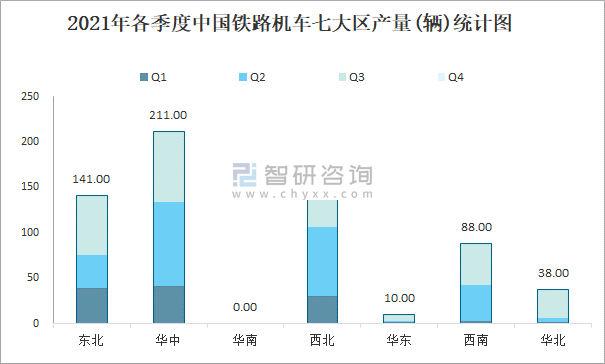 根據國家統計局數據顯示:2021年各季度中國鐵路機車主要集中在西北、東北、華中地區生產;2021年1-9月中國鐵路機車產量大區分布不均衡,其中西北地區產量最高,特別是陜西省產量等于整個西北地區總產量;2021年1-9月中國鐵路機車只在少數幾個省市生產,陜西、遼寧、湖南等省產量最多。
