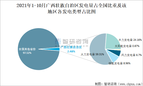 2021年1-10月廣西壯族自治區(qū)發(fā)電量占全國比重及該地區(qū)各發(fā)電類型占比圖