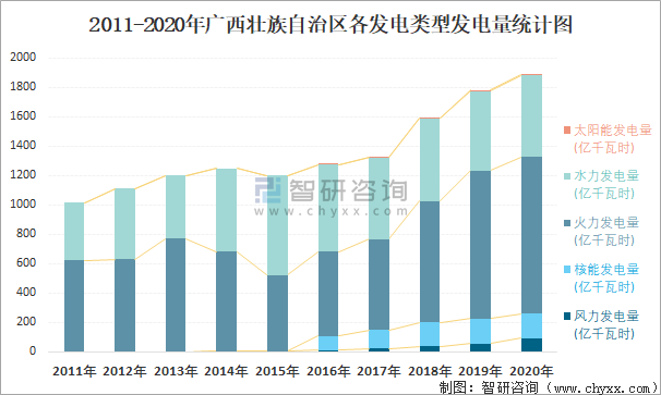 2011-2020年廣西壯族自治區(qū)各發(fā)電類型發(fā)電量統(tǒng)計圖