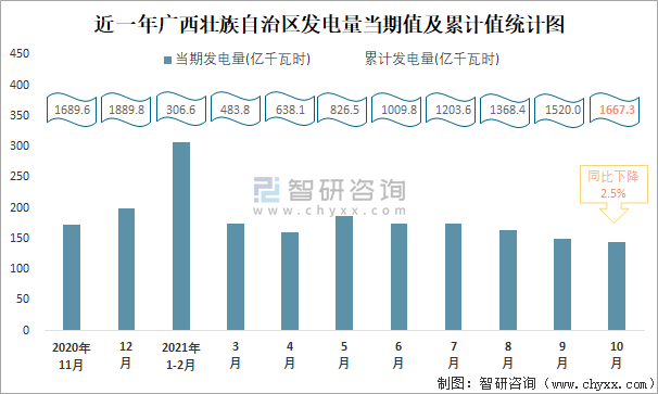 近一年廣西壯族自治區(qū)發(fā)電量當期值及累計值統(tǒng)計圖