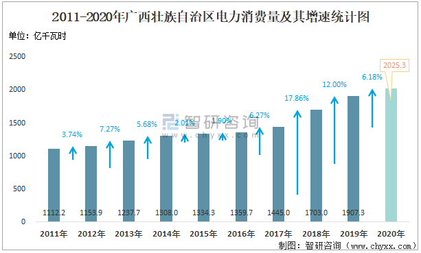 2011-2020年廣西壯族自治區(qū)電力消費量及其增速統(tǒng)計圖