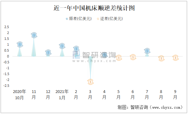 近一年中國(guó)機(jī)床順逆差(億美元)統(tǒng)計(jì)圖