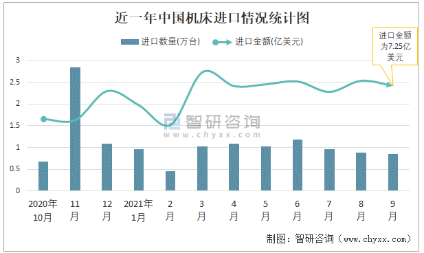 根據(jù)中國(guó)海關(guān)數(shù)據(jù)顯示:2021年9月中國(guó)機(jī)床進(jìn)口數(shù)量為0.86萬(wàn)臺(tái),同比下降2.3%,進(jìn)口金額為7.25億美元,同比增長(zhǎng)23.8%,2021年9月中國(guó)機(jī)床出口數(shù)量為236.24萬(wàn)臺(tái),同比下降3.8%,出口金額為7.15億美元,同比增長(zhǎng)18.4%;2021年1-9月中國(guó)機(jī)床進(jìn)口數(shù)量為8.32萬(wàn)臺(tái),進(jìn)口金額為62.45億美元,出口數(shù)量為2037.81萬(wàn)臺(tái),出口金額為61.99億美元。