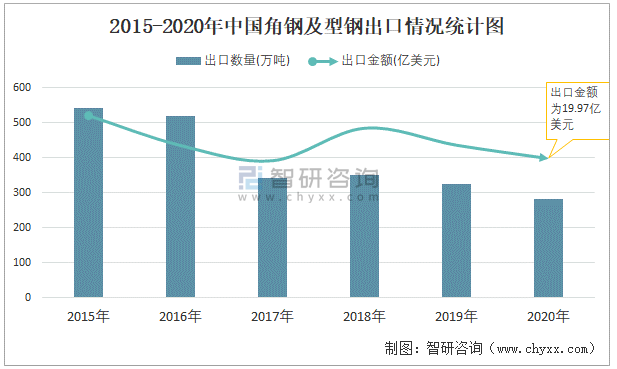 2015-2020年中國角鋼及型鋼出口情況統計圖