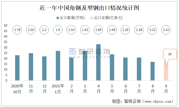 根據中國海關數據顯示:2021年9月中國角鋼及型鋼出口數量為18萬噸,同比增長5%,出口金額為2.42億美元,同比增長64.9%;2021年1-9月中國角鋼及型鋼出口數量為208萬噸,出口金額為19.83億美元。