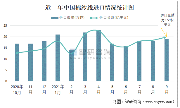 根據(jù)中國海關數(shù)據(jù)顯示:2021年9月中國棉紗線進口數(shù)量為19萬噸,同比增長5.5%,進口金額為5.59億美元,同比增長46.9%,2021年1-9月中國棉紗線進口數(shù)量為168萬噸,進口金額為45.82億美元。