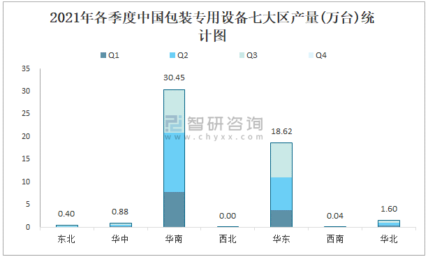 2021年各季度中國包裝專用設備七大區產量統計圖