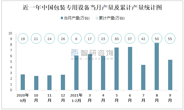 近一年中國包裝專用設備當月產量及累計產量統計圖