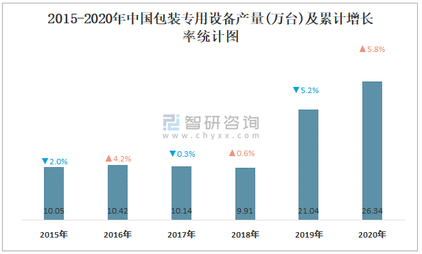 2015-2020年中國包裝專用設備產量及累計增長率統計圖