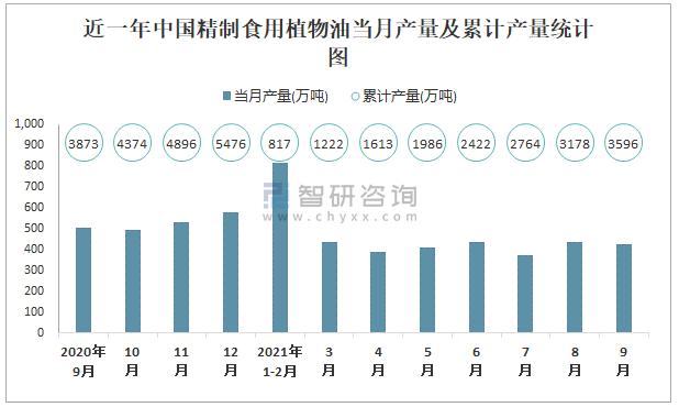 近一年中國精制食用植物油當月產量及累計產量統計圖