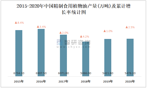 2015-2020年中國精制食用植物油產量及累計增長率統計圖