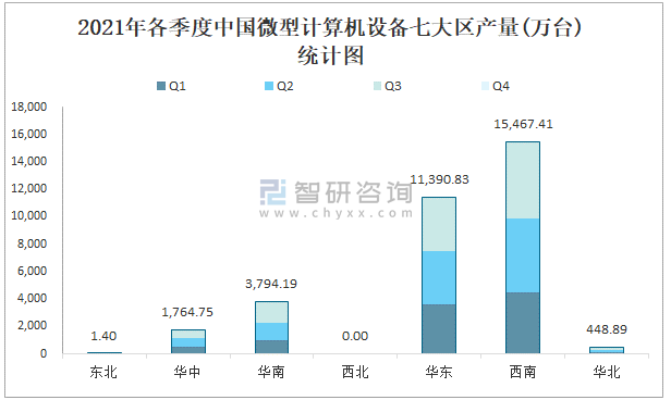 2021年各季度中國微型計算機設備七大區產量統計圖