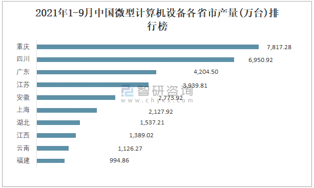 2021年1-9月中國微型計算機設備各省市產量排行榜
