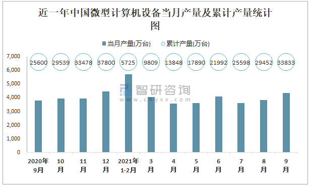 近一年中國微型計算機設備當月產量及累計產量統計圖