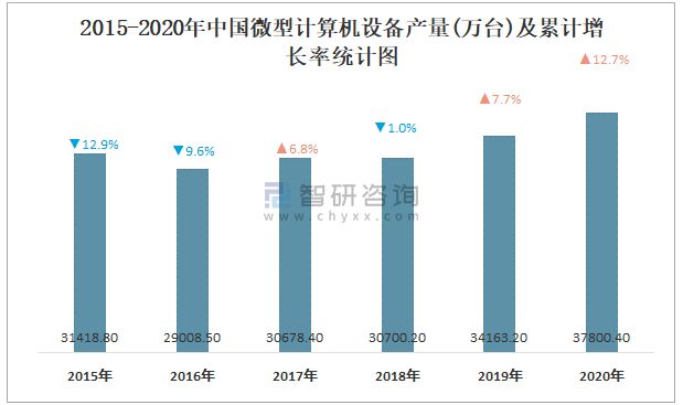 2015-2020年中國微型計算機設備產量及累計增長率統計圖