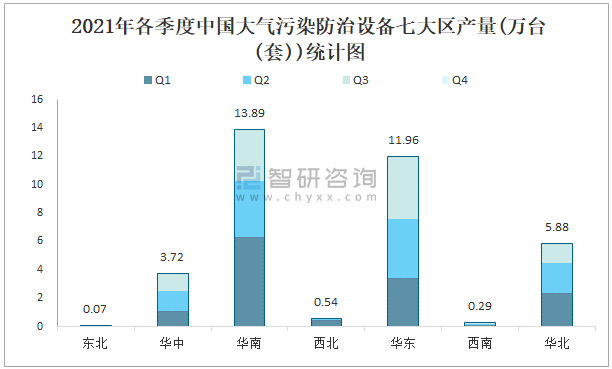 2021年各季度中國大氣污染防治設備七大區產量統計圖
