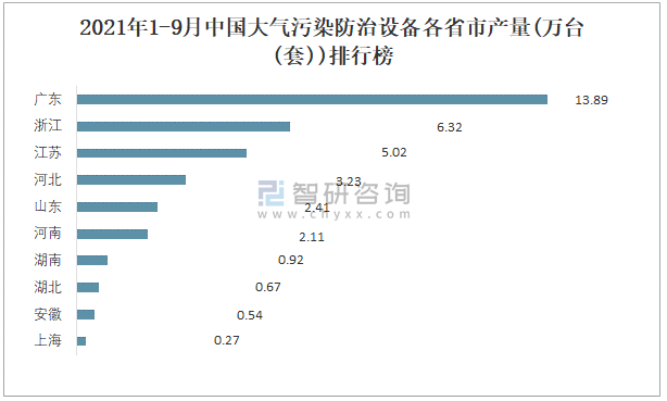 2021年1-9月中國大氣污染防治設備各省市產量排行榜