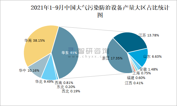 2021年1-9月中國大氣污染防治設備產量大區占比統計圖