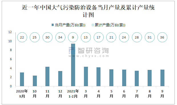 近一年中國大氣污染防治設備當月產量及累計產量統計圖