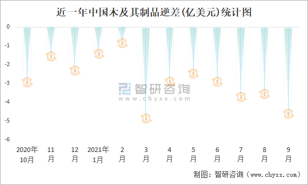 根據中國海關數據顯示:近一年中國木及其制品進口金額總體大于出口金額,進出口貿易全部為逆差,逆差規模在2月縮減至最小,此后有所擴大。